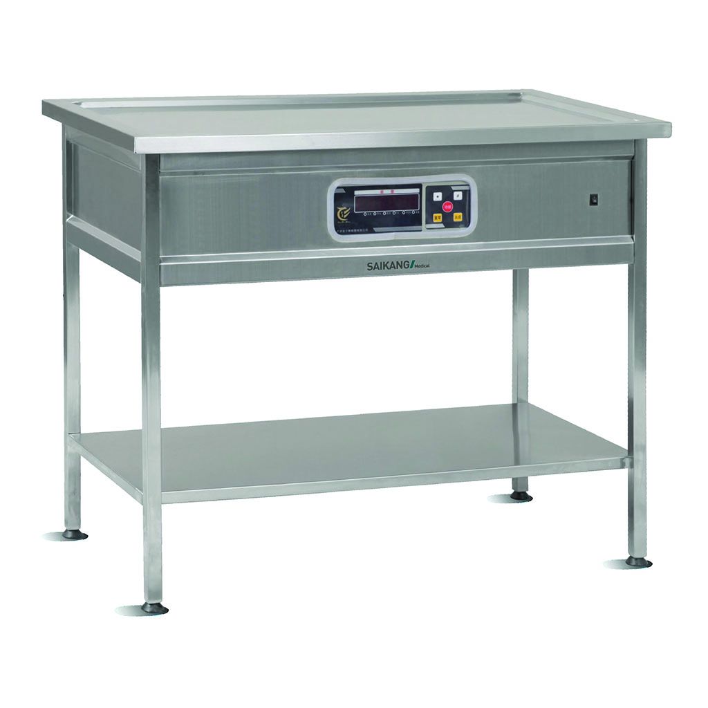 The treatment table, made of polished high-grade stainless steel, features an integrated electronic scale for precise pet weight measurement and a storage board for sundries.