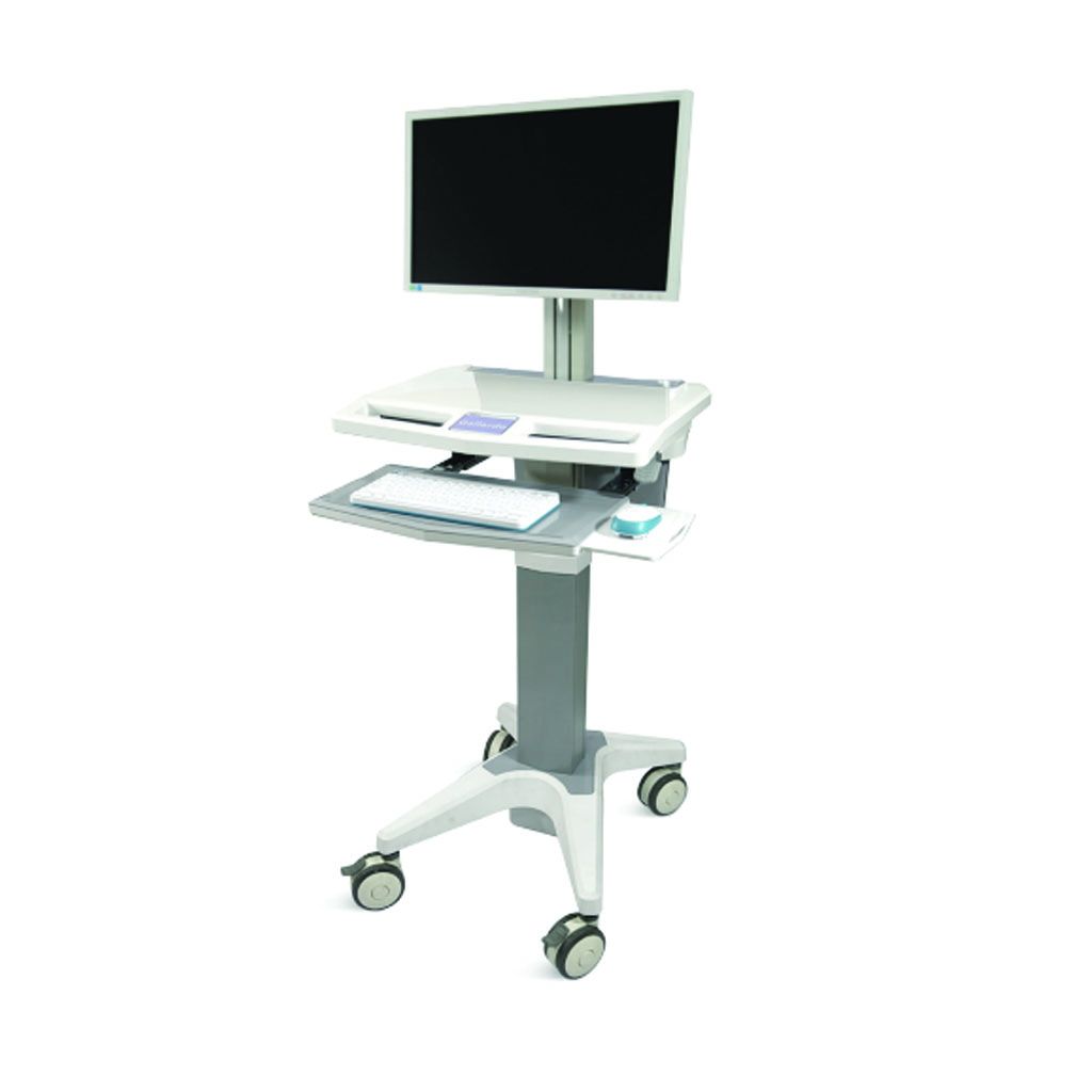 Aluminum alloy column with ABS-covered metal base for stability, computer holder for PCs up to 22″ and 12kg, storage bin, telescopic mouse holder, ABS table top, and medical-grade castors.